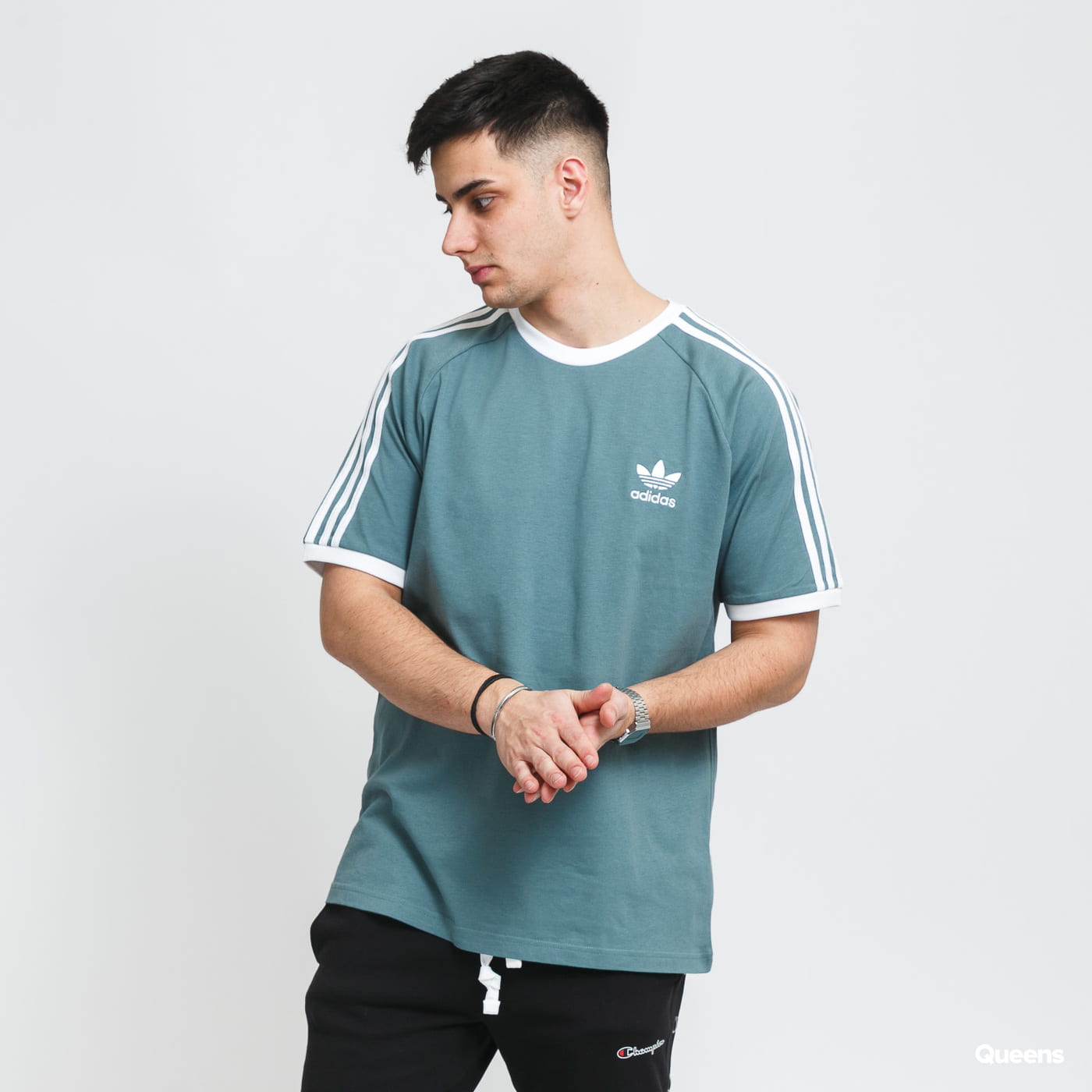 Zelené pánské tričko s krátkými rukávy od značky adidas Originals s decentním logem na hrudi a bílými pruhy na rukávech.