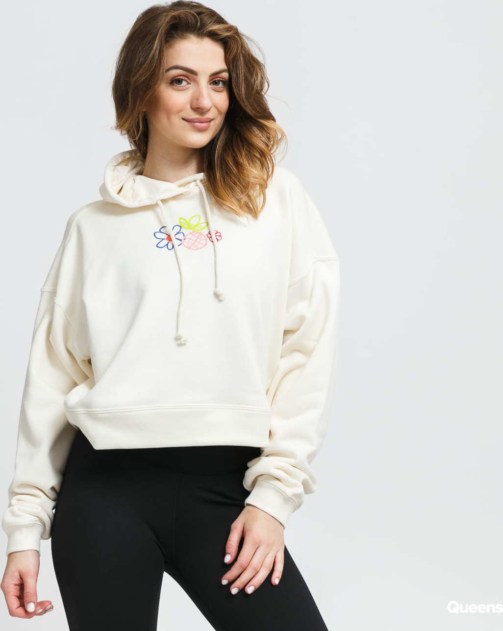Krémová dámská mikina s kapucí a klokaní kapsou od značky adidas Originals s barevným motivem na hrudi.