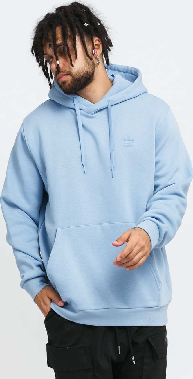 Modrá pánská mikina s kapucí a klokaní kapsou od značky adidas Originals s decentními logy na hrudi a zádech.