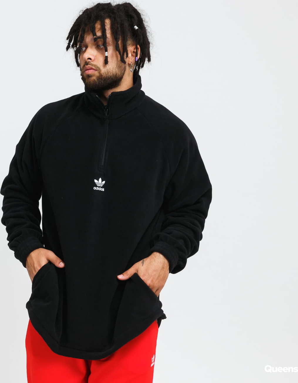 Černá pánská bunda s předními kapsami od značky adidas Originals s bílými logy na hrudi a zádech.