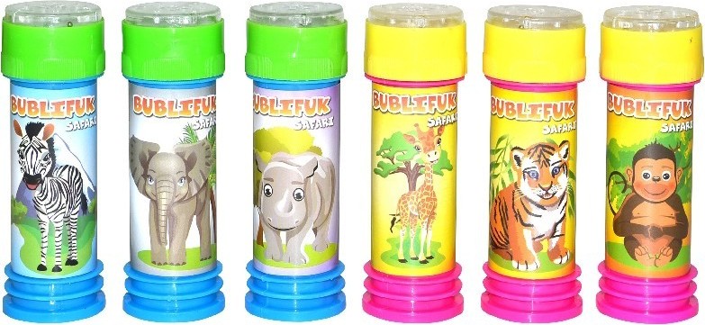 Bublifuk safari zvířátka. Objem 55 ml. 6 variant: zebra, slon, nosorožec, žirafa, tygr, opice. Display box – 36 ks.