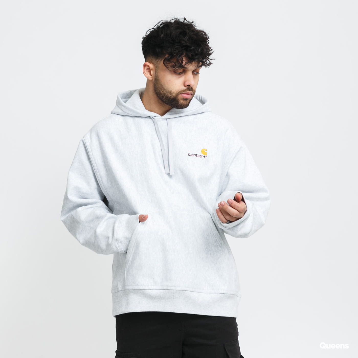 Světle šedivá pánská mikina s kapucí a klokaní kapsou od značky Carhartt WIP s decentním logem na přední části.