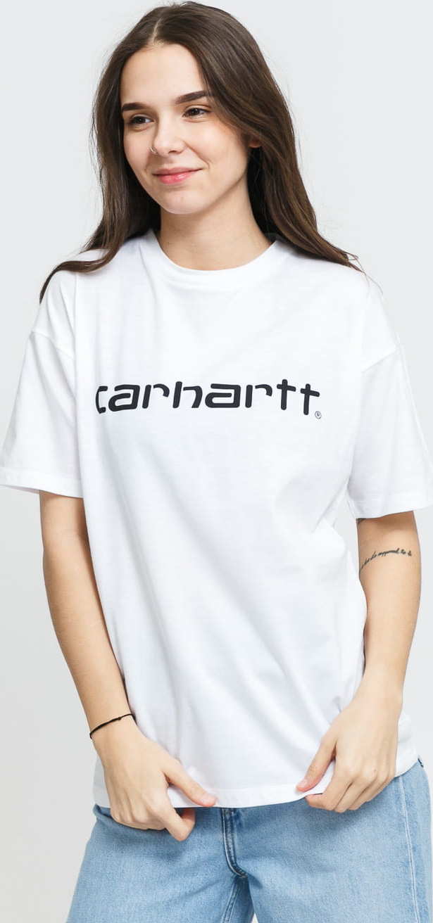 Bílé dámské tričko s krátkými rukávy od značky Carhartt WIP s černým logem na hrudi.