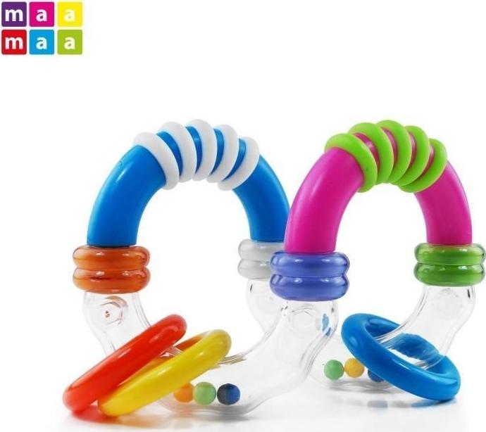 Chrastítko. Velikost 11 cm. Chrastítko MaaMaa pro zdravý rozvoj Hrklávka je odjakživa oblíbená hračka těch nejmenších. Chrastící zvuk děti uklidňuje, navíc se děťátko učí vnímat a zpracovávat okolní podněty. Hračky pro miminka mají krásný vzhled, jsou lehké a navíc fungují jako aktivní hračky – stimulují dítě vizuálně i prostřednictvím hmatu. Chrastítko má na sobě barevné kroužky a uvnitř kuličky, které krásně chrastí. Výhody hraček MaaMaa: zkoumání a objevování pomoc při prožezávání prvních zoubků cvičení hrubé motoriky a snadného úchopu koordinace oko-ruka hračky jsou vhodné pro děti od narození Velikost: 11 x 9 cm