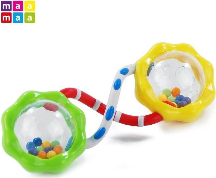 Chrastítko je ve tvaru zajímavé činky. Na obou koncích jsou koule plné menšími pestrobarevnými kulič Chrastítko MaaMaa pro zdravý rozvoj Hrklávka je odjakživa oblíbená hračka těch nejmenších. Chrastící zvuk děti uklidňuje, navíc se děťátko učí vnímat a zpracovávat okolní podněty. Hračky pro miminka mají krásný vzhled, jsou lehké a navíc fungují jako aktivní hračky – stimulují dítě vizuálně i prostřednictvím hmatu. Chrastítko je ve tvaru zajímavé činky. Na obou koncích jsou koule plné menšími pestrobarevnými kuličkami, díky kterým hračka krásně chrastí. Koule jsou upevněny 2 zkroucenými tyčinkami. Dětem se bude dobře držet. Výhody hraček MaaMaa: zkoumání a objevování pomoc při prožezávání prvních zoubků cvičení hrubé motoriky a snadného úchopu koordinace oko-ruka hračky jsou vhodné pro děti od narození Velikost: 14 x 5 cm