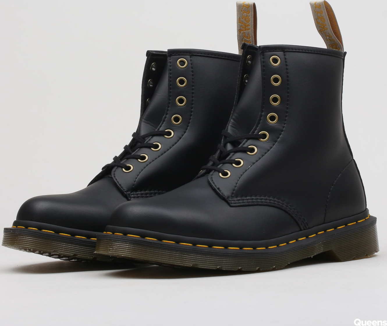 Kotníkové boty od značky Dr. Martens s pojmenováním Vegan 1460 v černém provedení s hnědou podrážkou.