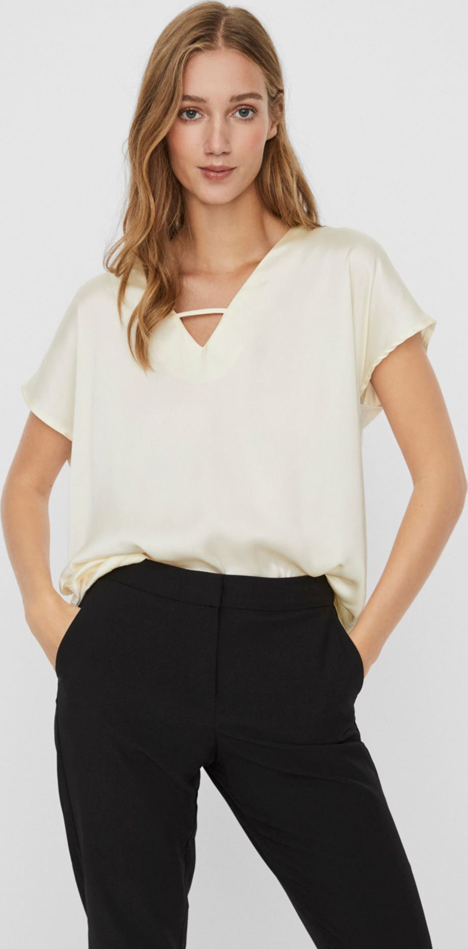 Materiál: 95% viskoza, 5% elastan Střih: loose fit Výstřih: do V Rukáv: krátký Povrch: lesklý Praní: 30°C Barva: bílá