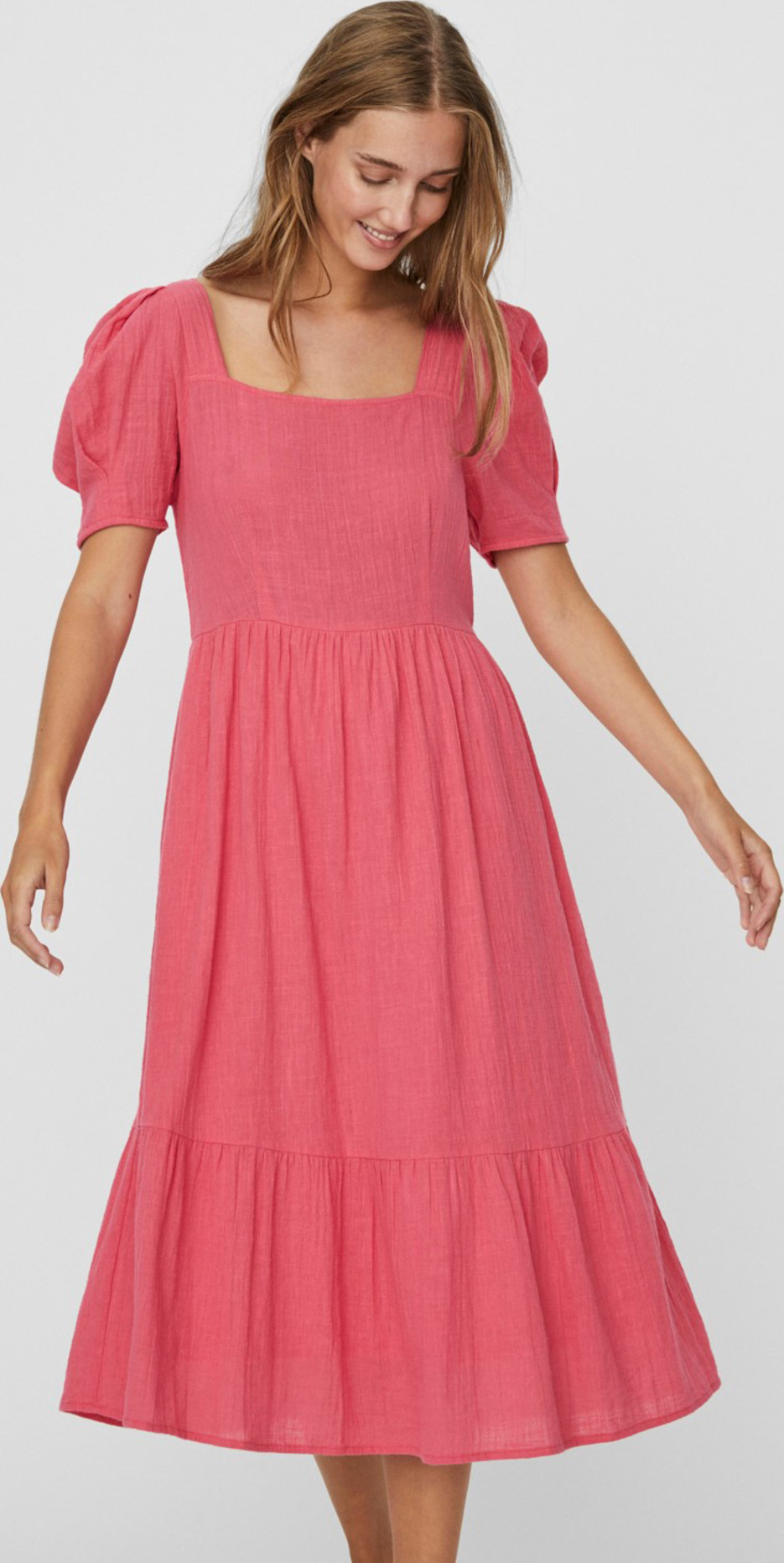 Materiál: 100 % organická bavlna Střih: midi Typ: volnočasový Vzor: hladký Výstřih: hranatý Rukáv: krátký Praní: 30°C Barva: růžová