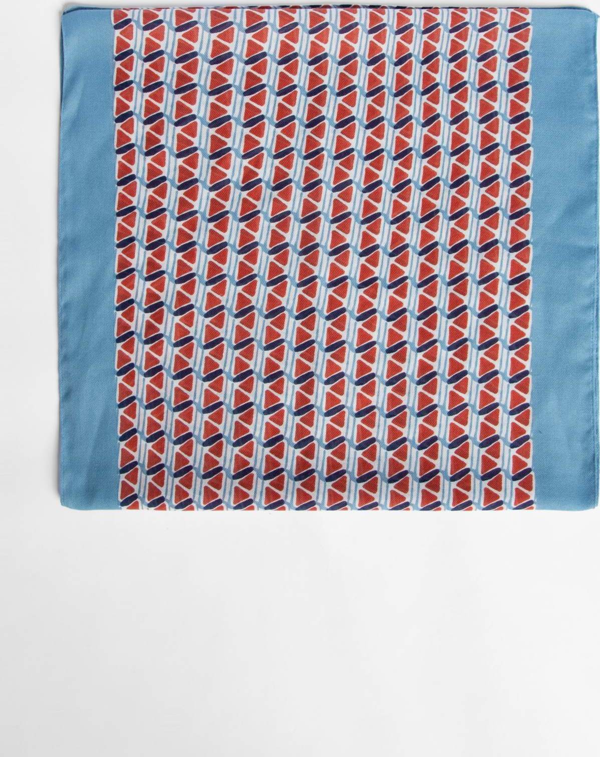 – – dámská obdélníková šála – geometrický vzor, kontrastní lemování – obšité okraje – ušitá z jemné látky Rozměry: 180 x 48 cm.