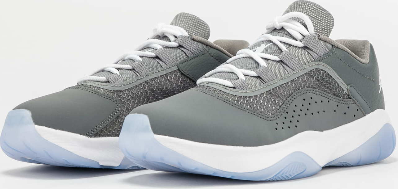 Nízké tenisky od značky Air Jordan s pojmenováním 11 CMFT Low (GS) v šedivém provedení s modrobílou podrážkou.
