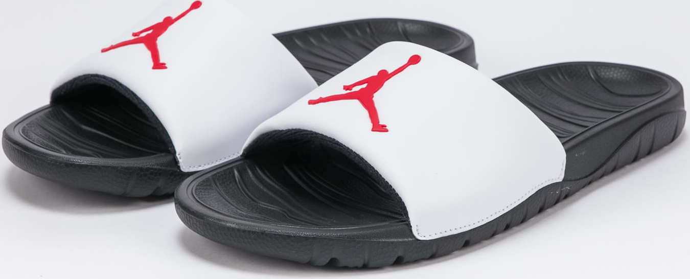 Pantofle od značky Air Jordan s pojmenováním Break Slide v černobílém provedení s černými logy na horní části.