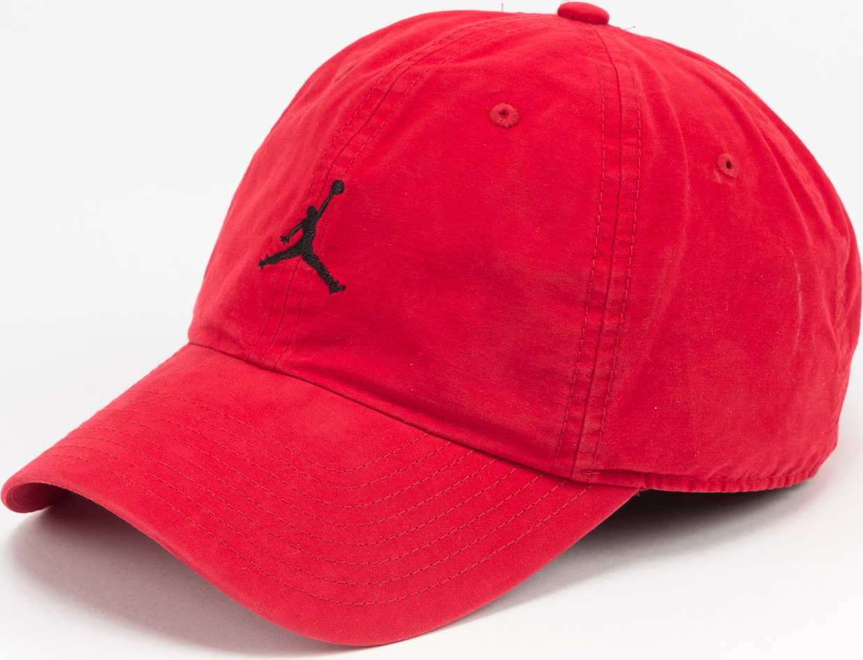 Klasická kšiltovka se zadním zapínáním od značky Air Jordan v červeném provedení s černým logem na přední části.