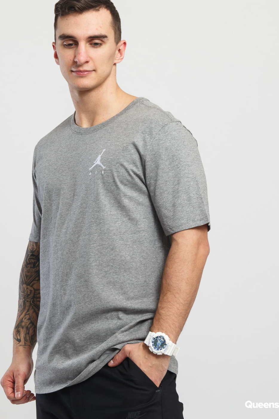 Šedivé pánské tričko s krátkými rukávy od značky Air Jordan s bílým logem na přední části.
