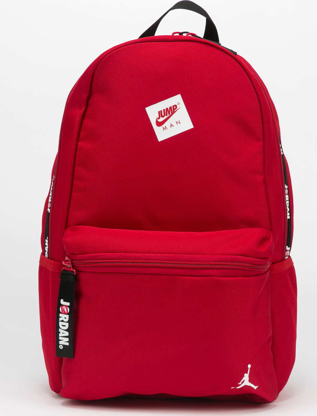 Jednokomorový batoh od značky Air Jordan v červeném provedení s přední kapsou, černými částmi a decentními logy.