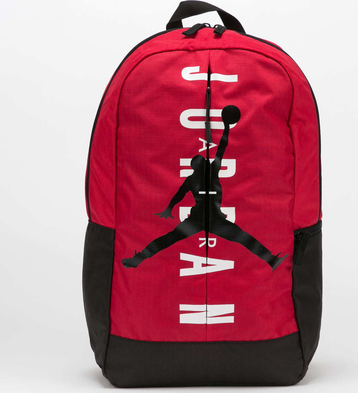 Jednokomorový batoh od značky Air Jordan v červeném provedení s černými částmi, přední kapsou a výrazným logem na přední části.