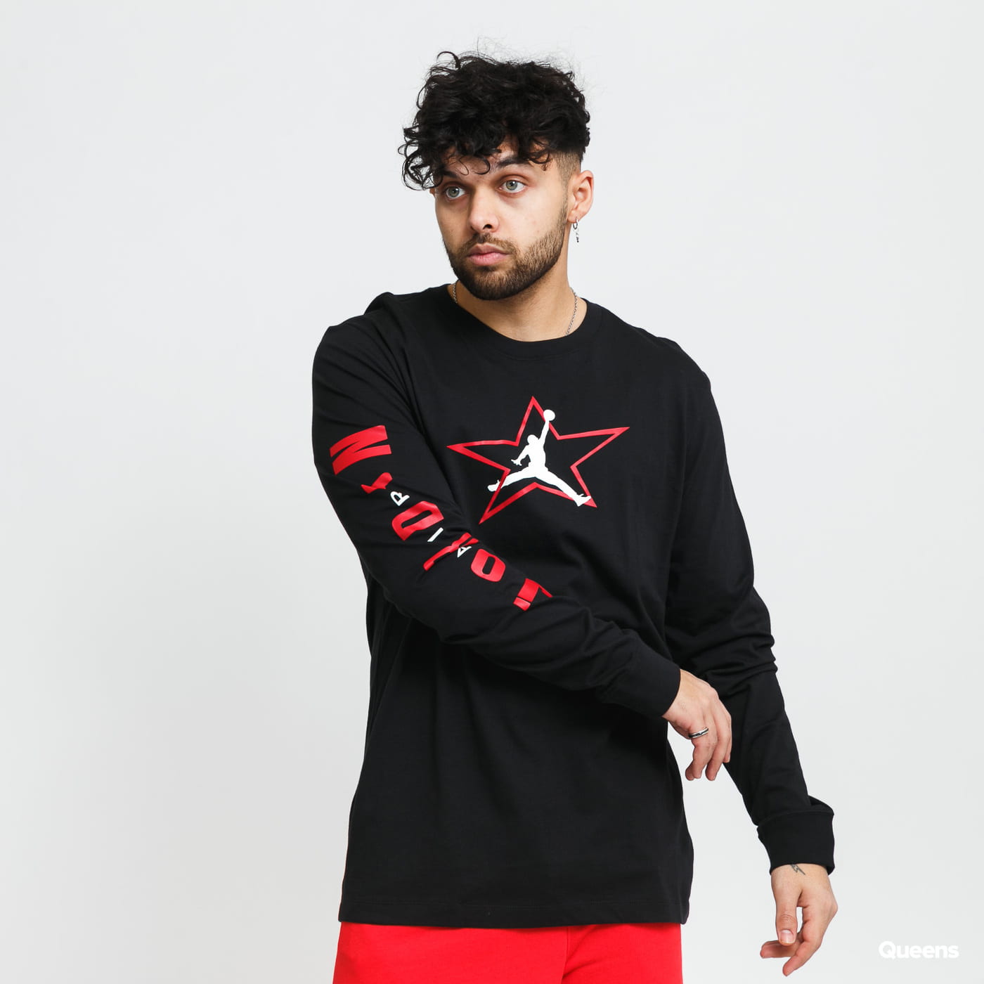 Černé pánské tričko s dlouhými rukávy od značky Air Jordan s logem na hrudi a nápisem na rukávě.