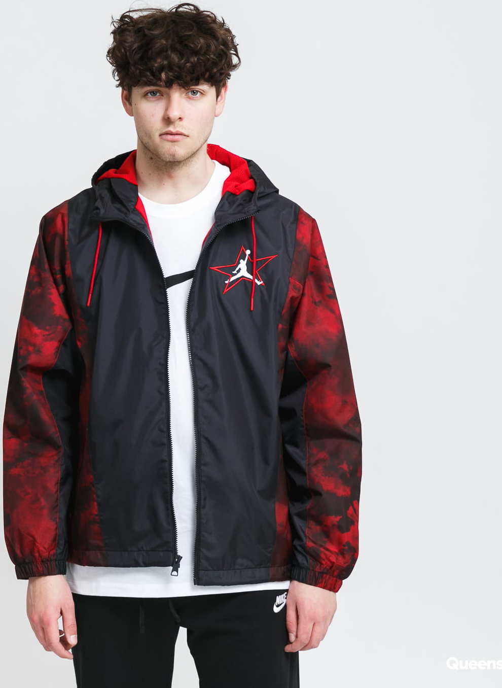 Černá pánská větrová bunda s kapucí od značky Air Jordan s černými motivy, bílými logy na hrudi a bílým motivem na zádech.