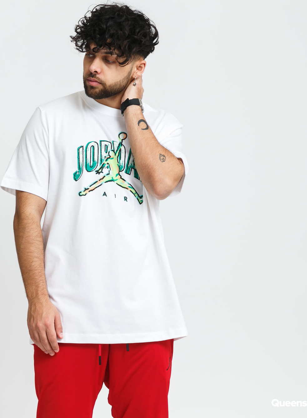 Bílé pánské tričko s krátkými rukávy od značky Air Jordan s barevným motivem na hrudi.