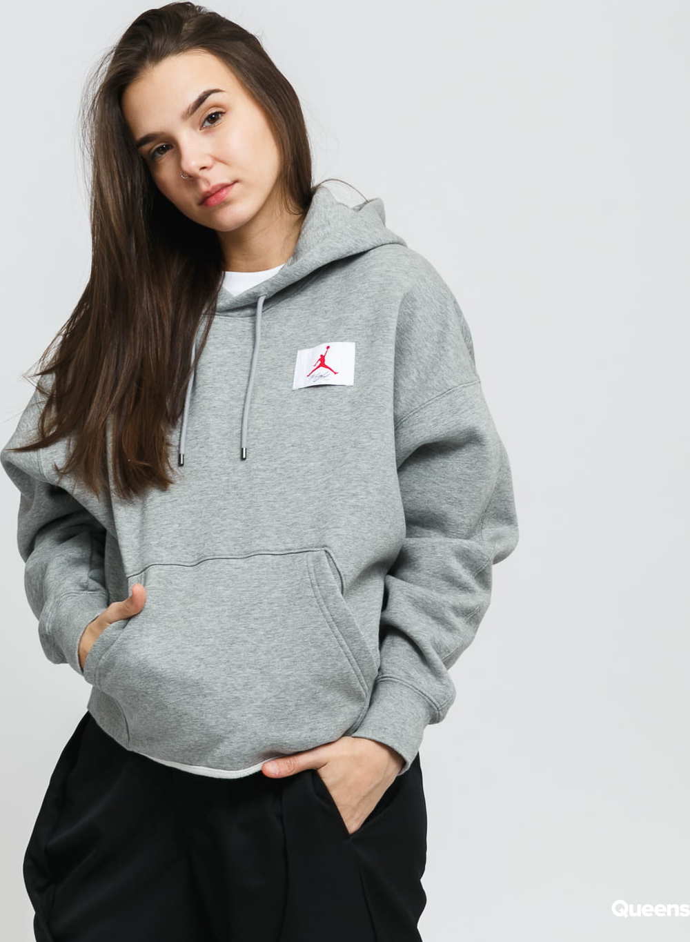 Šedivá dámská mikina s kapucí a klokaní kapsou od značky Air Jordan s decentním logem na hrudi a výrazným motivem na zádech.