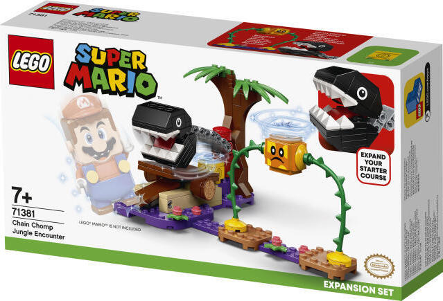 Rozšiřte svůj startovací set od LEGO® Super Mario™ o vzrušující výzvu s Chain Chompem! Vykročte do úrovně Soda Jungle a dávejte pozor, abyste nespadli do jedovaté bažiny. Porazte Bramballa s trnitýma nohama jedním mocným skokem. Dostaňte se na plošinu a shoďte z ní Chain Chompa. Až bude nebezpečný kousající protivník mimo hru, skočte na kostku s mincemi a získejte svou odměnu! • Děti mají nyní jedinečnou šanci obohatit svou startovací sadu LEGO® Super Mario™ o rozšiřující set Chain Chomp a setkání v džungli (71381), a užít si s kamarády ještě větší porci společné zábavy. • Tento jedinečný set obsahuje LEGO® figurky dvou kultovních protivníků, kterými jsou Chain Chomp a Bramball. Těm se musí LEGO® Mario™ (figurka není součástí balení) postavit a přemoci je. • Obsahuje skákací plošinu, ze které lze překonat Chain Chompa a speciální kostku s mincemi, která ukrývá nemalou odměnu pro hráče. • Tento LEGO® set s 160 dílky představuje úžasný dárek k narozeninám či jakékoliv jiné příležitosti pro děti ve věku od 7 let, které vlastní startovací set Dobrodružství s Mariem (71360), který je vyžadován pro kompletní herní zážitek. • Tento modul v základním rozestavení měří přes 10 cm na výšku, 21 cm na šířku a 15 cm do hloubky. Lze jej však mnoha způsoby přestavovat a kombinovat s dalšími sety z řady LEGO® Super Mario™. • Bezplatná aplikace LEGO® Super Mario™ nabízí návody na stavění a bezpečnou platformu pro sdílení herních nápadů. Seznam kompatibilních zařízení s operačním systémem Android a iOS najdete na stránkách LEGO.com/devicecheck. • Sběratelské sety LEGO® Super Mario™ přenášejí oblíbenou postavičku do reálného světa a dávají všem fanouškům nekonečnou škálu možností, jak rozšiřovat, přestavovat, přizpůsobovat a vytvářet vlastní herní úrovně. • Již od roku 1958 splňují LEGO® dílky přísné standardy tak, aby byly kompatibilní a umožňovaly konzistentní spojování a rozebírání. • LEGO® dílky testujeme téměř všemi představitelnými způsoby, abychom zajistili, že vyhovují přísným bezpečnostním normám. Počet dílků: 160 Doporučený věk: 7+