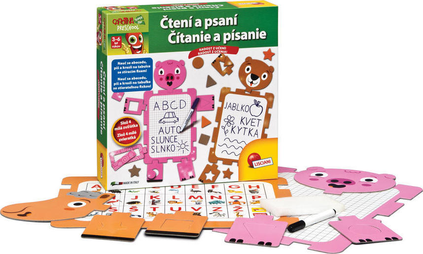 Tato naučná hra obsahuje 2 tabulky, na které lze psát z obou stran, a děti se tak hravou formou učí číst, psát a malovat. Na jedné tabulce jsou písmena a názvy zvířátek v abecedním pořadí. Druhá tabulka je z jedné strany čtverečkovaná a z druhé bílá. Na tuto tabulku mohou kreslit a psát podle své fantazie!! Mohou si také vytvořit svoji vlastní tabulku tak, že k rámu tabulky přiloží hlavy, ocasy a tlapky čtyř zvířat. V přiloženém návodu najdete mnoho cvičení a podnětů k učení psaní a čtení. Balení obsahuje: 2 z obou stran popisovatelné tabulky 4 hlavy 16 tlapek 4 ocasy stírací fix houbičku návod Doporučený věk: od 3 let