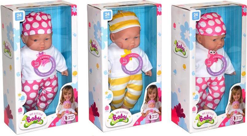 Miminko mluvící. Aktivace stiskem bříška 6 variant – sovička, žabička, kočička, kuřátko, ovečka, sl Roztomilé miminko ve veselém slušivém oblečku si na první pohled zamiluje každá malá holčička. Panenka při zmáčknutí bříška vydává zvuky – smích, pláč, mama… Obleček i čepičku lze sundat, takže malá maminka může miminko převlékat. Varianty: růžový obleček s puntíky fialový obleček s puntíky žlutý obleček s pruhy zelený obleček s pruhy modrý obkeček s pruhy Velikost: 38 cm Doporučený věk: od 1 roku