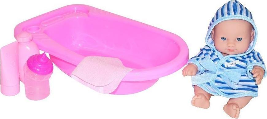Miminko s vaničkou. Velikost miminka 20 cm. Velikost vaničky 32 cm. Součástí vanička, miminko, krém, Koupací set s panenkou obsahuje vše potřebné pro koupání miminka. Miminko, které je součástí setu se krásně ponoří do vany a můžete ho umýt a pak i pohodlně osušit přiloženou osuškou. Varianty: S modrým župánkem S růžovým župánkem Rozměry: panenka 20 cm vanička 31,5 x 17,5 x 7 cm krmící láhev 9 x 4 x 4 cm