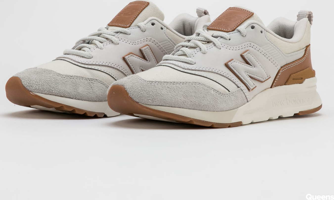 Nízké tenisky od značky New Balance s označením CM997HAF v béžovém provedení s hnědými motivy a postranními logy.