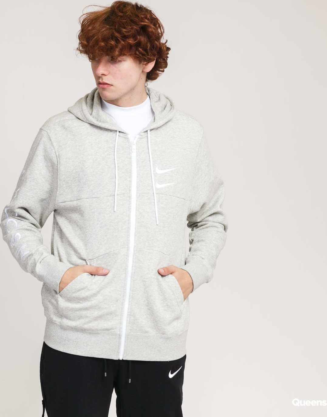 Světle šedivá pánská mikina s kapucí a klokaní kapsou od značky Nike s decentními logy na hrudi.