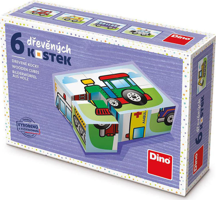 Dřevěné kostky s motivem dopravy zábavnou formou procvičí u nejmenších dětí jemnou motoriku, představivost a logické myšlení. Skládání kostek motivuje také k vyprávění příběhů a rozvíjí fantazii. Počet kostek: 6 Doporučený věk: od 3 let Dřevěné obrázkové kostky DINO jsou vyrobeny ze zdravotně nezávadných materiálů, splňují požadavky dané evropskou normou na bezpečnost hraček ČSN EN 71-1 a jsou atestované v ČR. Vyrobeno v České republice.