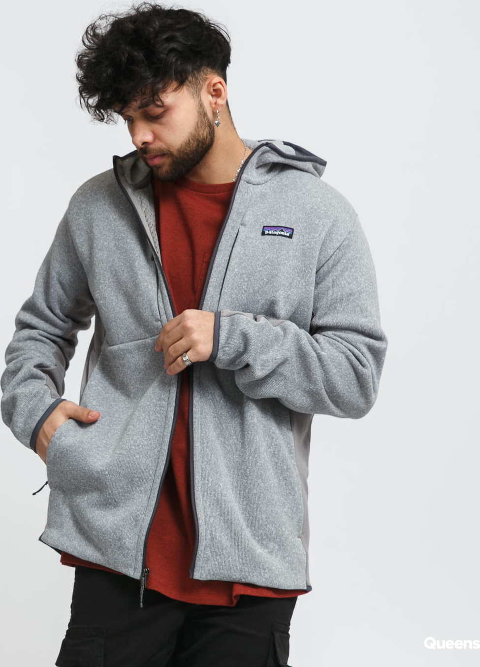 Šedivá pánská mikina s kapucí a klokaní kapsou od značky Patagonia s decentním logem na přední části.