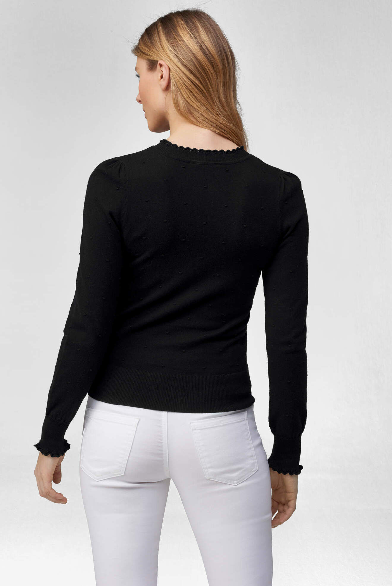 – – dámský přiléhavý pulovr – s 3D puntíky – zakulacený výstřih s volánkem – dlouhé, jemně nadýchané rukávy – volánky na spodním okraji – ušitý z žerzeje Modelka na obrázku je vysoká 178 cm a nosí velikost S.