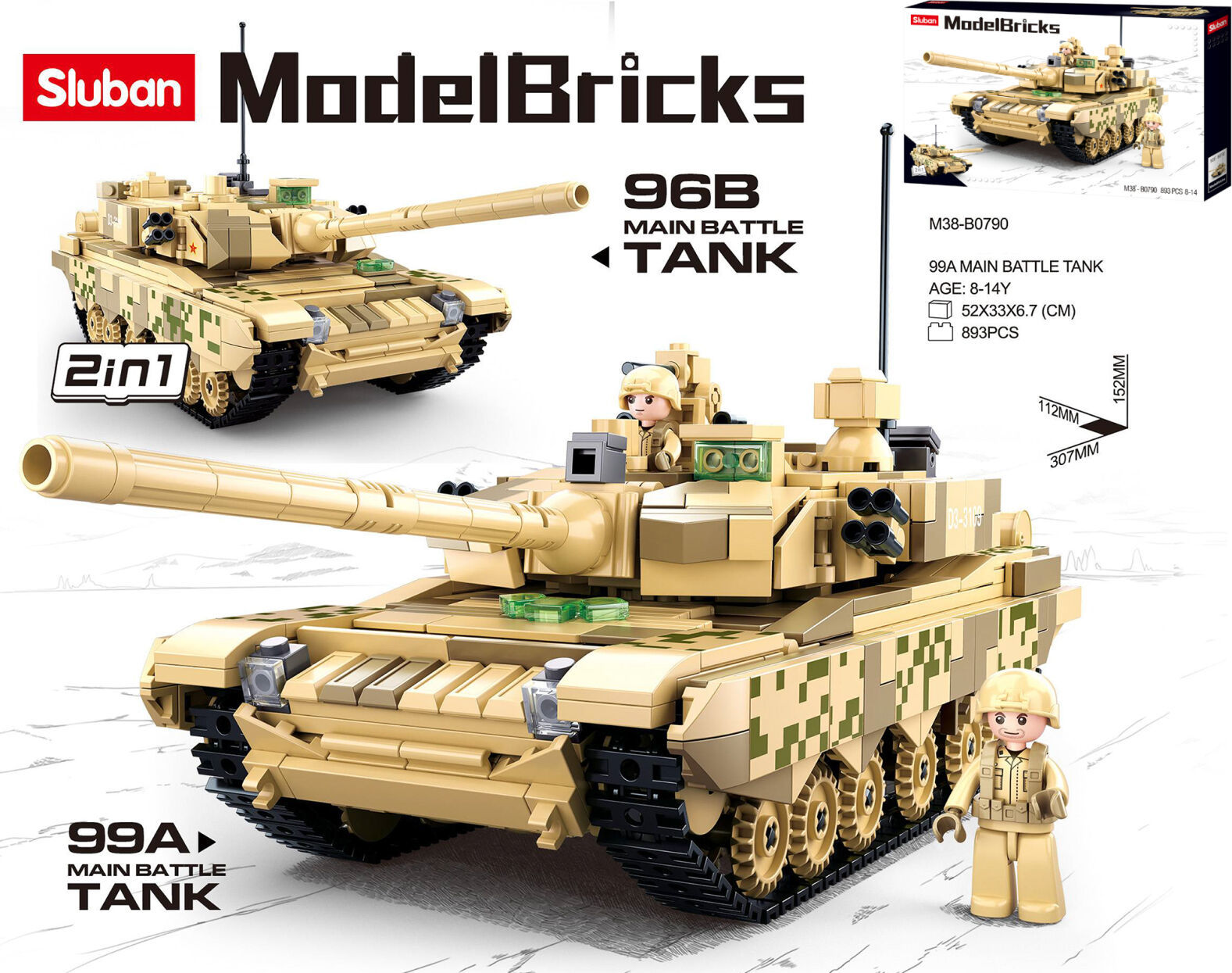 Model bitevního tanku s otáčejícím dělem. Na pojízdných pásech zvládne jakýkoliv terén, všude kde je potřeba silné obrany. Stavebnice obsahuje dvě figurky vojáků a 893 dílku, ze kterých postavíš tank delší než 30cm. Tank je možné postavit ve dvou verzích podle přiloženého návodu. Všechny figurky Sluban mají realistický tvar, hlavičku i zápěstí na pohyblivém kloubu, v pase se otáčejí o 360° a nožičky jsou pohyblivé ve směru chůze a zároveň si zachovaly plnou kompatibilitu s kostičkami. Dílky stavebnic Sluban jsou kombinovatelné se stavebnicemi jiných značek stejného typu.