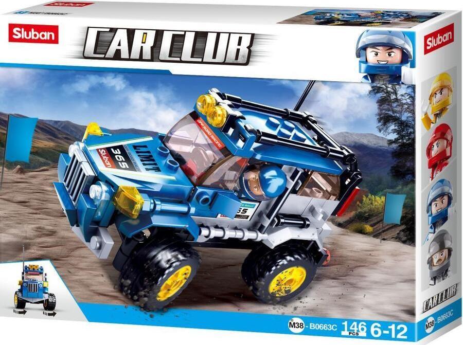 Série Car Club má ve své nabídce i pořádné Offroady, které nepřekvapí žádný terén. Třetí ze čtyř je Užij si divokou jízdu pořádným offroadem. Díky otočné přední nápravě se vyhneš všem překážkám. Délka vozu po sestavení je necelých 12cm. Všechny figurky Sluban mají realistický tvar, hlavičku i zápěstí na pohyblivém kloubu, v pase se otáčejí o 360° a nožičky jsou pohyblivé ve směru chůze a zároveň si zachovaly plnou kompatibilitu s kostičkami. Dílky stavebnic Sluban jsou kombinovatelné se stavebnicemi jiných značek stejného typu. Stavebnice obsahuje 145 dílků a jednu figurku. Doporučený věk: 6+