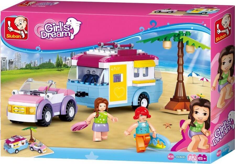 Girls Dream je dlouhodobě oblíbená kolekce se stavebnicemi pro holky. Dovolená kdekoliv se nám zachc Užij si dokonalou dovolenou, kdekoliv se Ti zachce. Nalož do karavanu vše, co potřebueš a můžeš vyrazit. Girls Dream je dlouhodobě oblíbená kolekce se stavebnicemi pro holky. Sestavený vůz s karavanem má délku necelých 25cm. Všechny figurky Sluban mají realistický tvar, hlavičku i zápěstí na pohyblivém kloubu, v pase se otáčejí o 360° a nožičky jsou pohyblivé ve směru chůze a zároveň si zachovaly plnou kompatibilitu s kostičkami. Dílky stavebnic Sluban jsou kombinovatelné se stavebnicemi jiných značek stejného typu. Stavebnice obsahuje část plánku města, 281 dílků, dvě figurky s vybavením. Doporučený věk: 6+