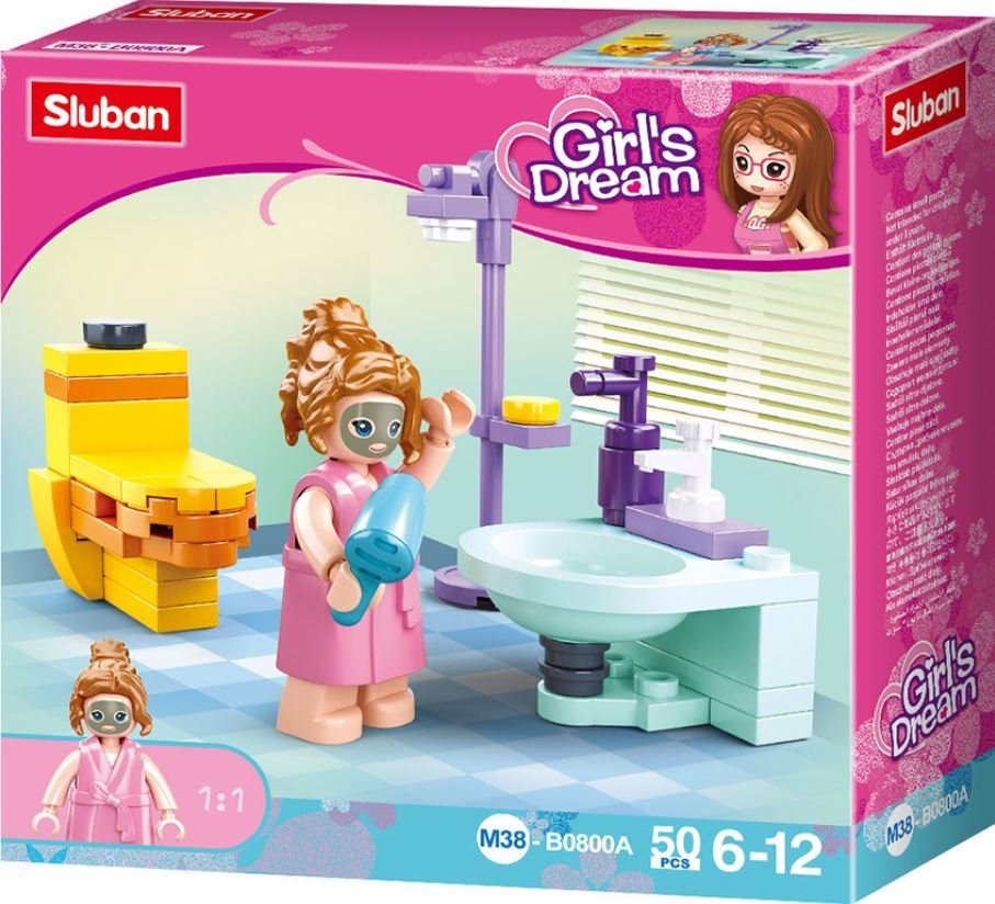 Stavebnice pro holky. Figurka v županu s pleťovou maskou a k ní umyvadlo, sprcha, záchod. Všechny figurky Sluban mají realistický tvar, hlavičku i zápěstí na pohyblivém kloubu, v pase se otáčejí o 360° a nožičky jsou pohyblivé ve směru chůze a zároveň si zachovaly plnou kompatibilitu s kostičkami. Dílky stavebnic Sluban jsou kombinovatelné se stavebnicemi jiných značek stejného typu.