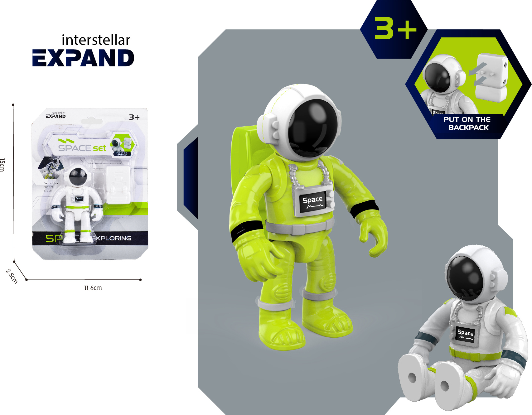 Vesmírný set s figurkou. Velikost figurky 7,5 cm. Součástí figurka kosmonauta a batoh s kyslíkem. 2 varianty – bílá, zelená.