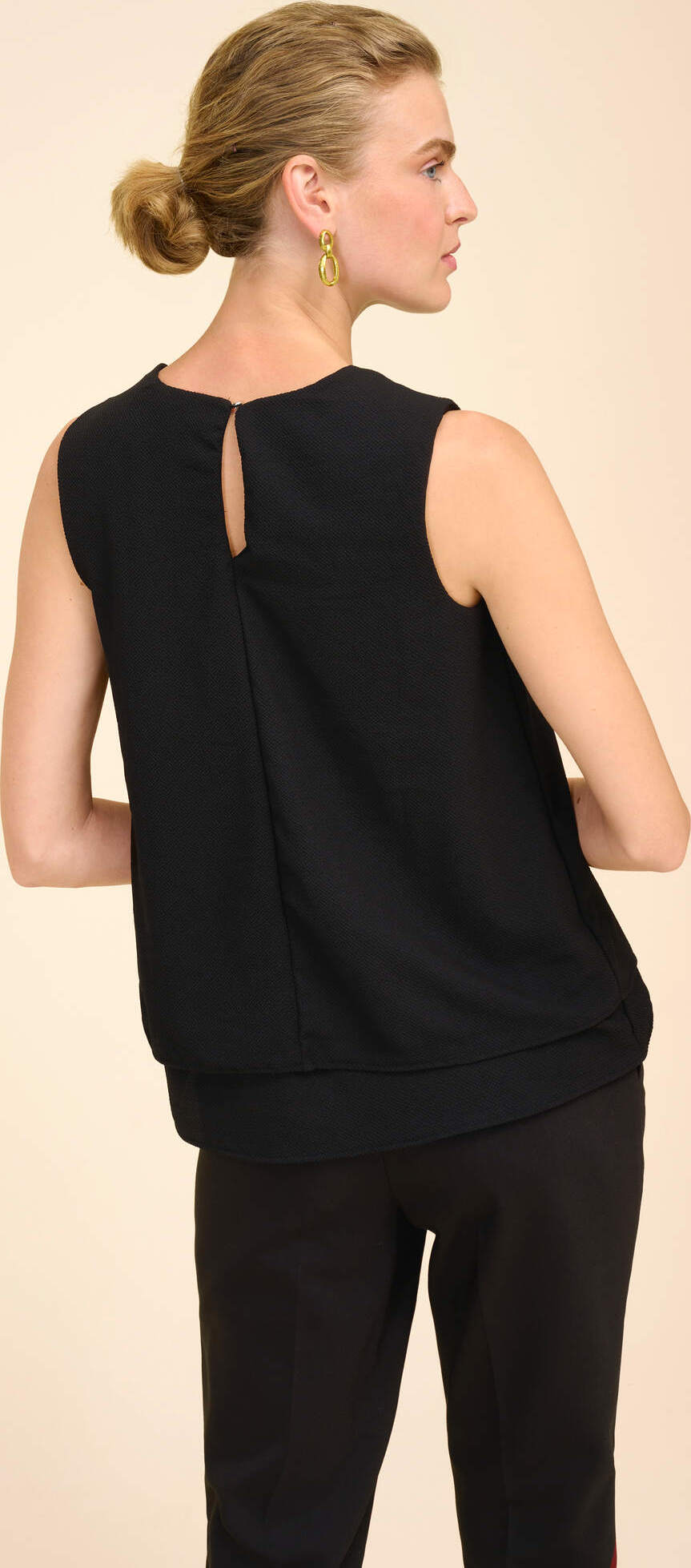 – – dámská volná halenka – zakulacený výstřih se záhyby – bez rukávů – vzadu: slzička na knoflík – ušitá z hebké látky Modelka na obrázku je vysoká 175 cm a nosí velikost 36/S.