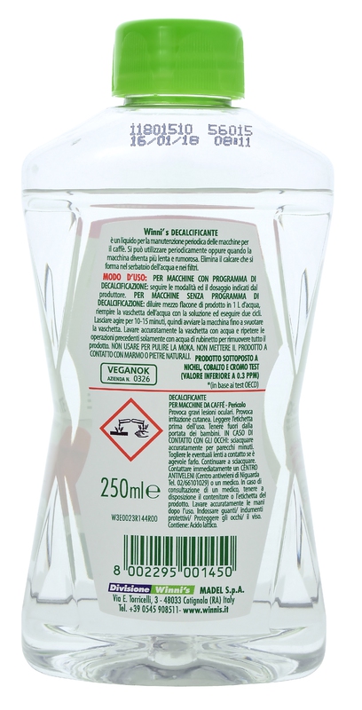 WINNIS Decalcificante per macchine da caffé je ekologický a hypoalergenní odvápňovač pro pravidelnou údržbu kávovarů Vhodný pro všechny typy kávovarů Odvápňovač je možné používat pravidelně jako prevenci když nevíte co na vodní kámen v kávovaru ale i až v případě že je kávovar pomalejší a hlučnější Odstraňuje vápenec vytvořený v nádobce vody a ve filtrech