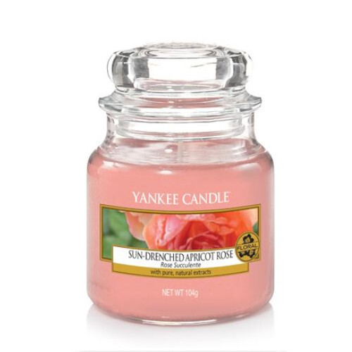 Aromatická svíčka Classic malá SunDrenched Apricot Rose v sobě skrývají květinovou vůni meruňkové růže vyšisované sluníčkem Jemné růžové lístky chutná šťavnatá meruňka nektarinka gardénie s čistým pižmem a jemným pudrem navodí příjemnou atmosféru