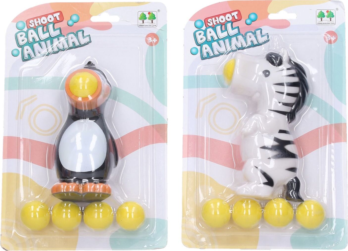 Zvířátko střílející míčky. Velikost 14 cm. Součástí 5 pěnových míčků. Míčky se střílí stlačením bříška zvířátka. 4 varianty – tučňák, zebra, prase, dino.